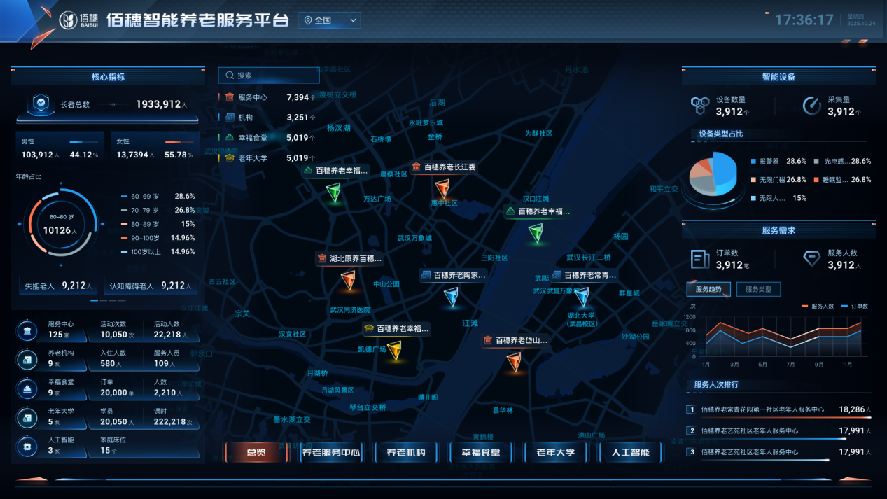 全面集成了長者、智能設(shè)備、服務(wù)需求等各類信息,不僅能展示長者總數(shù)、性別年齡分布、失能及認知障礙等特殊老人數(shù)量,還涵蓋服務(wù)中心、機構(gòu)等養(yǎng)老設(shè)施相關(guān)數(shù)據(jù)。通過地圖標記、餅圖、折線圖等可視化方式,將復(fù)雜數(shù)據(jù)直觀呈現(xiàn),同時精準統(tǒng)計設(shè)備數(shù)量、采集量、訂單數(shù)等,支持按時間篩選。